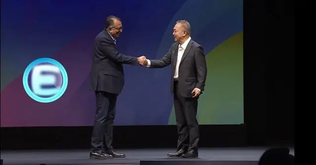 在VMware Explore 2023会议上,VMware首席执行官Raghu Raghuram(左)邀请博通总裁兼首席执行官陈福阳(右)上台,探讨VMware发展的“新篇章”